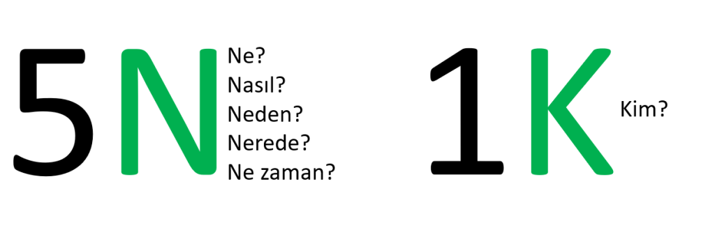 5N1K yöntemi gazetecilik gibi alanlarda kullanılan, bir bilgiyi veya olayı aydınlatmada kullanılan etkili bir yöntemdir. Konunun veya olayın daha iyi anlaşılabilmesi için bilgilerin toplanmasında bizlere çerçeve çizer. 5N1K ile aydınlatılmak istenilen konu veya olay hakkında genel bir bilgi sahibi oluruz. Her sektörde ve süreçte rahatlıkla kullanabiliriz.