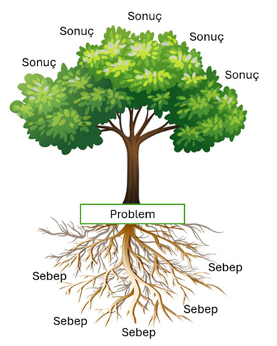 Ağaç görselinde görüldüğü gibi, problemden köklere inmek için “neden?” sorusu tekrarlanarak sorulur. Örneklerle daha net anlaşılacaktır.