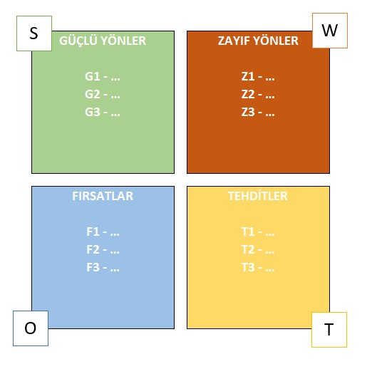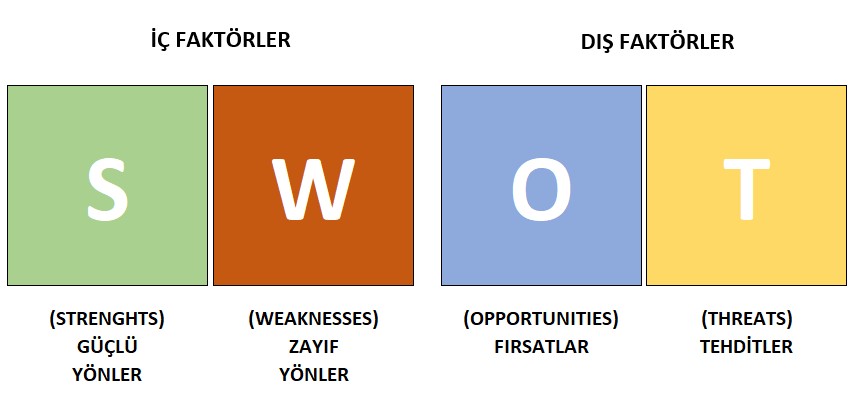 Aşağıdaki gibi SWOT kelimesi, analizi oluşturan dört unsurun İngilizce karşılıklarının baş harflerinden oluşmaktadır.
